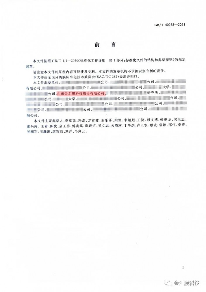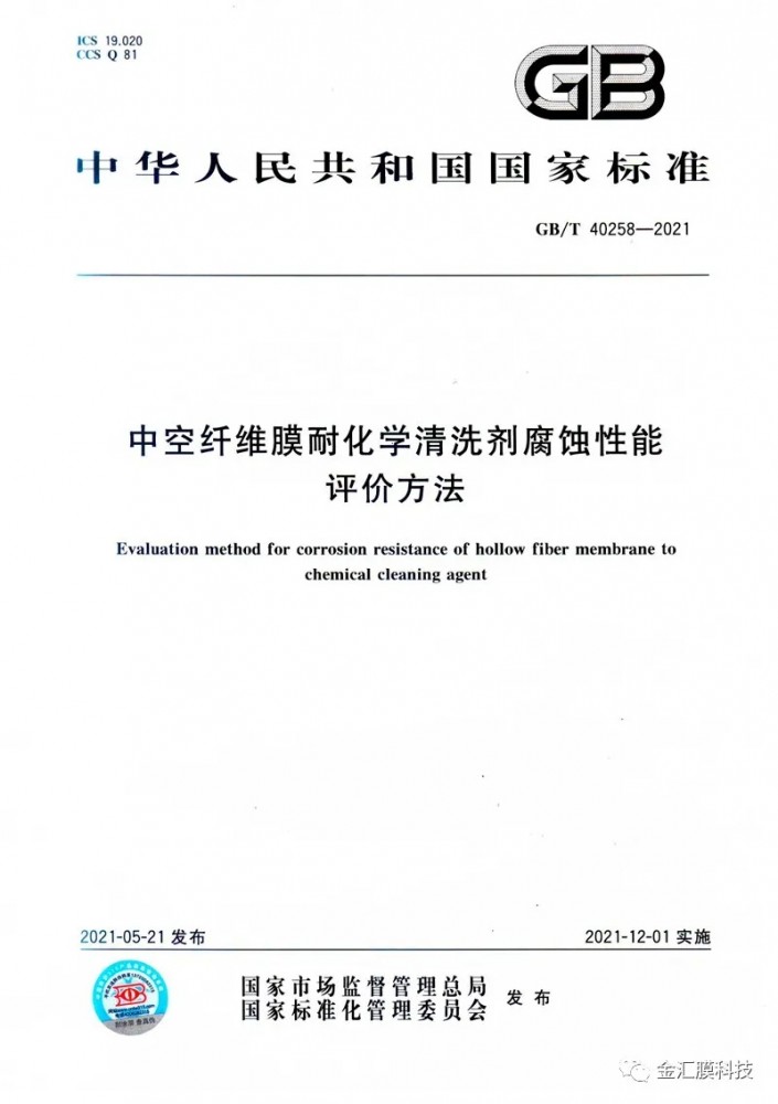 山東金匯膜科技股份有限公司參與起草編寫了國家標(biāo)準(zhǔn):《中空纖維膜絲截面結(jié)構(gòu)尺寸的測定圖像分析法》、 《中空纖維膜耐化學(xué)清洗劑腐蝕性能評價方法》2項,現(xiàn)已發(fā)布。