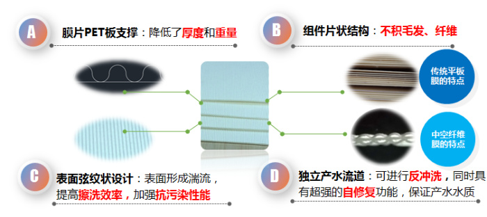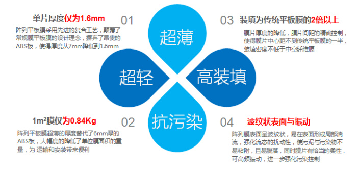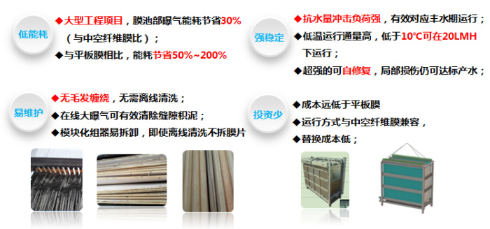 (2)組件結構緊湊,裝填面積高,裝填比傳統(tǒng)平板膜提高 200%以上,能耗小于 傳統(tǒng)平板膜的 50%,甚至更低;