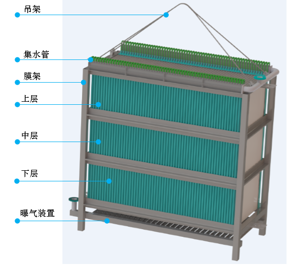 (9)膜組器的獨特結構設計,充分強化了水力學循環(huán),提高水力對膜表面的擦洗 效率,同時提高氧氣的利用率;